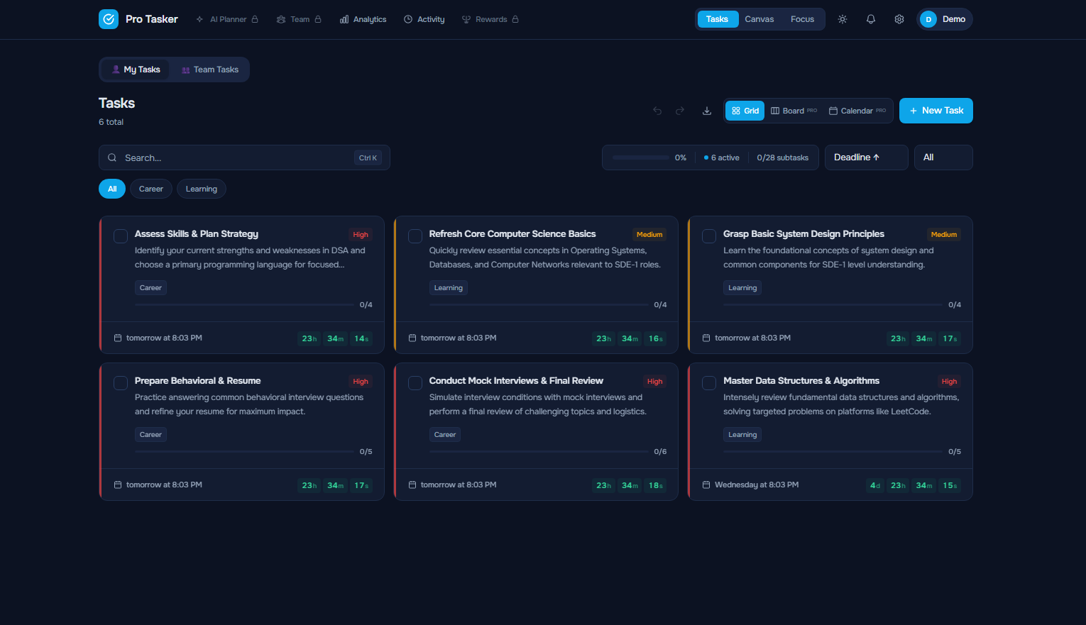 Pro Tasker is an AI-driven full-stack productivity SaaS built for high-output planning, execution, and analytics in one place
